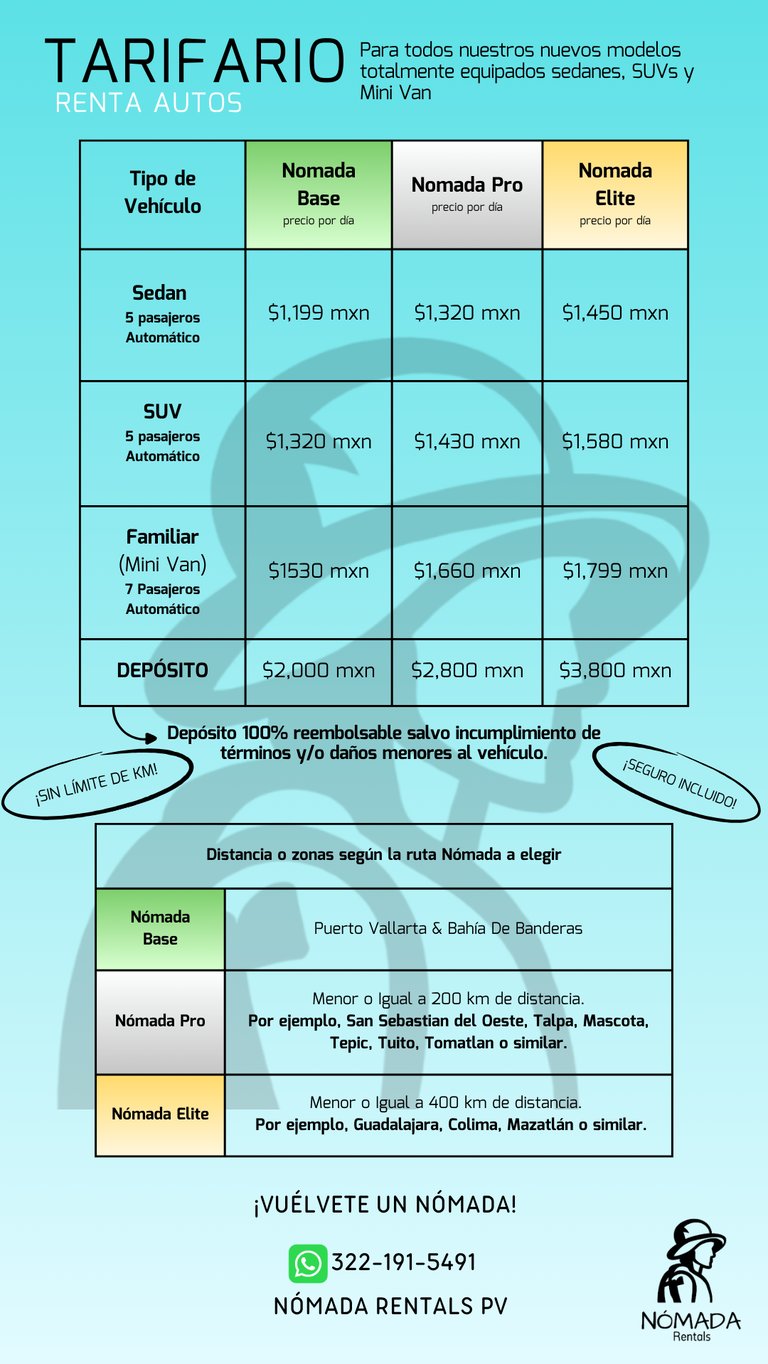 At Nomada Rentals, our rates adjust to your destination. Select your travel zone when booking and enjoy total freedom of movement with no extra mileage fees.